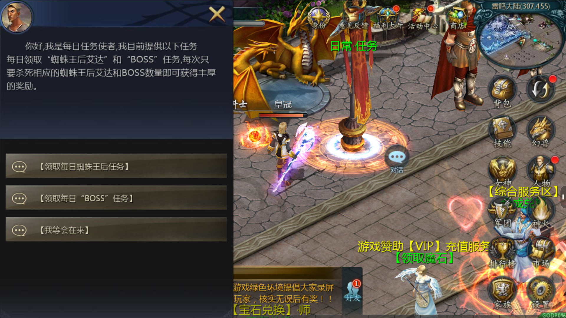 每日任务:杀死20只蜘蛛王后,可以获得1500真魔石奖励,杀死100只BOSS,可获得600真魔石,每日可完成一次。