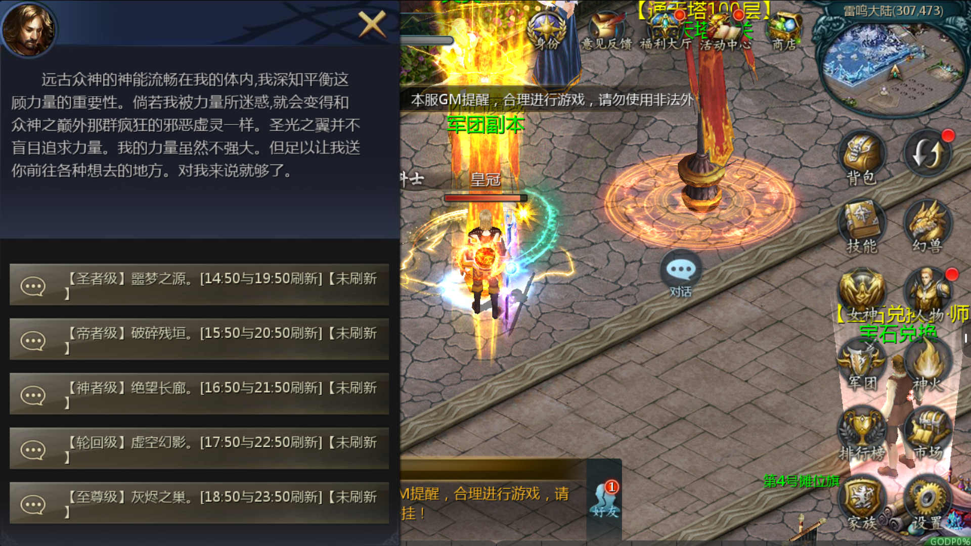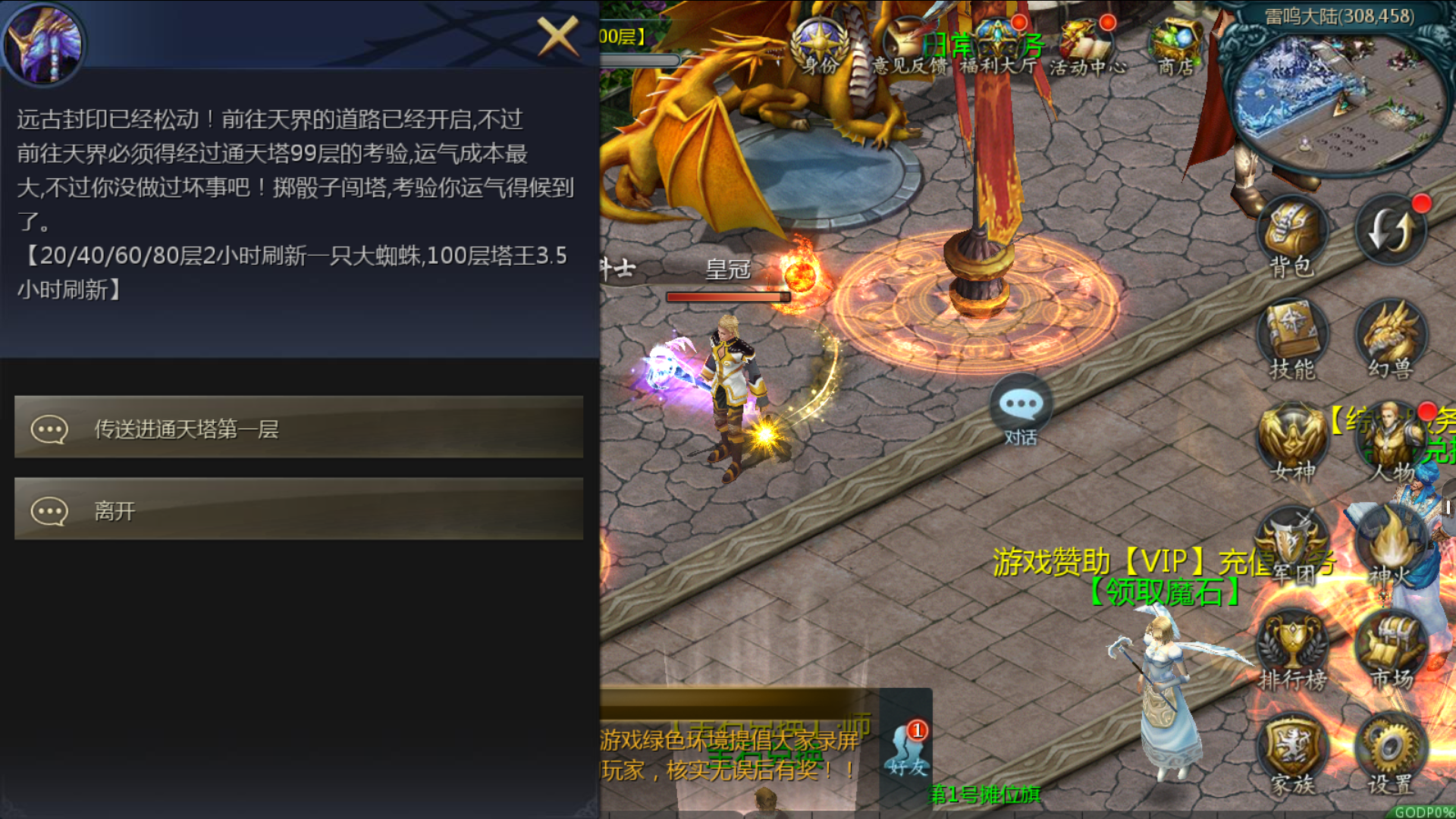 游戏介绍:本服新增100层通天塔,20/40/60/80层每2小时刷新一只大蜘蛛,100层塔王3.5小时刷新,塔王掉落特球,副宠,灵魂等珍贵物资。